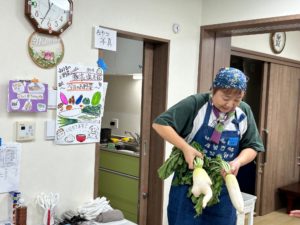 採れたて旬のお野菜の説明を聞きながら、面白い大根の形を見て、