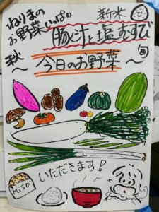 今回のメニューは、「お野菜たっぷりの豚汁と新米のおにぎり」です。
