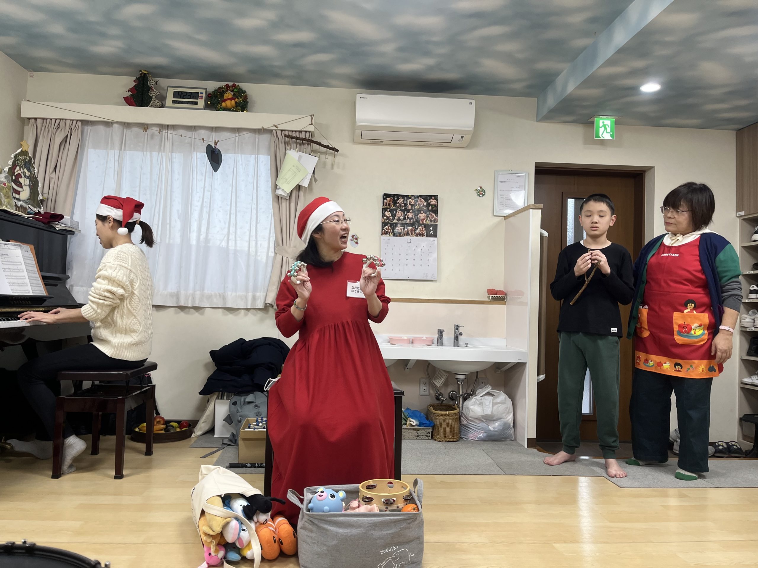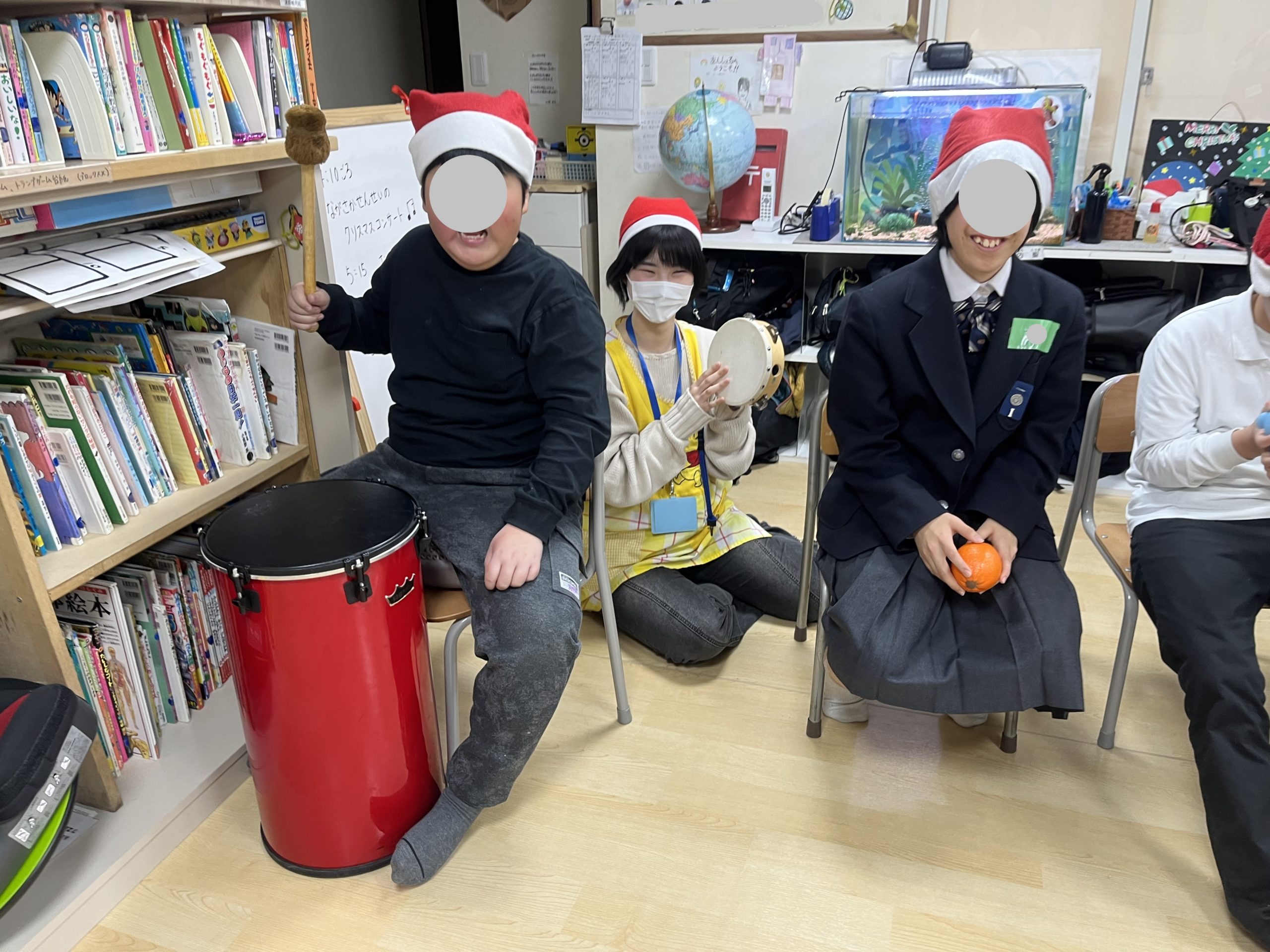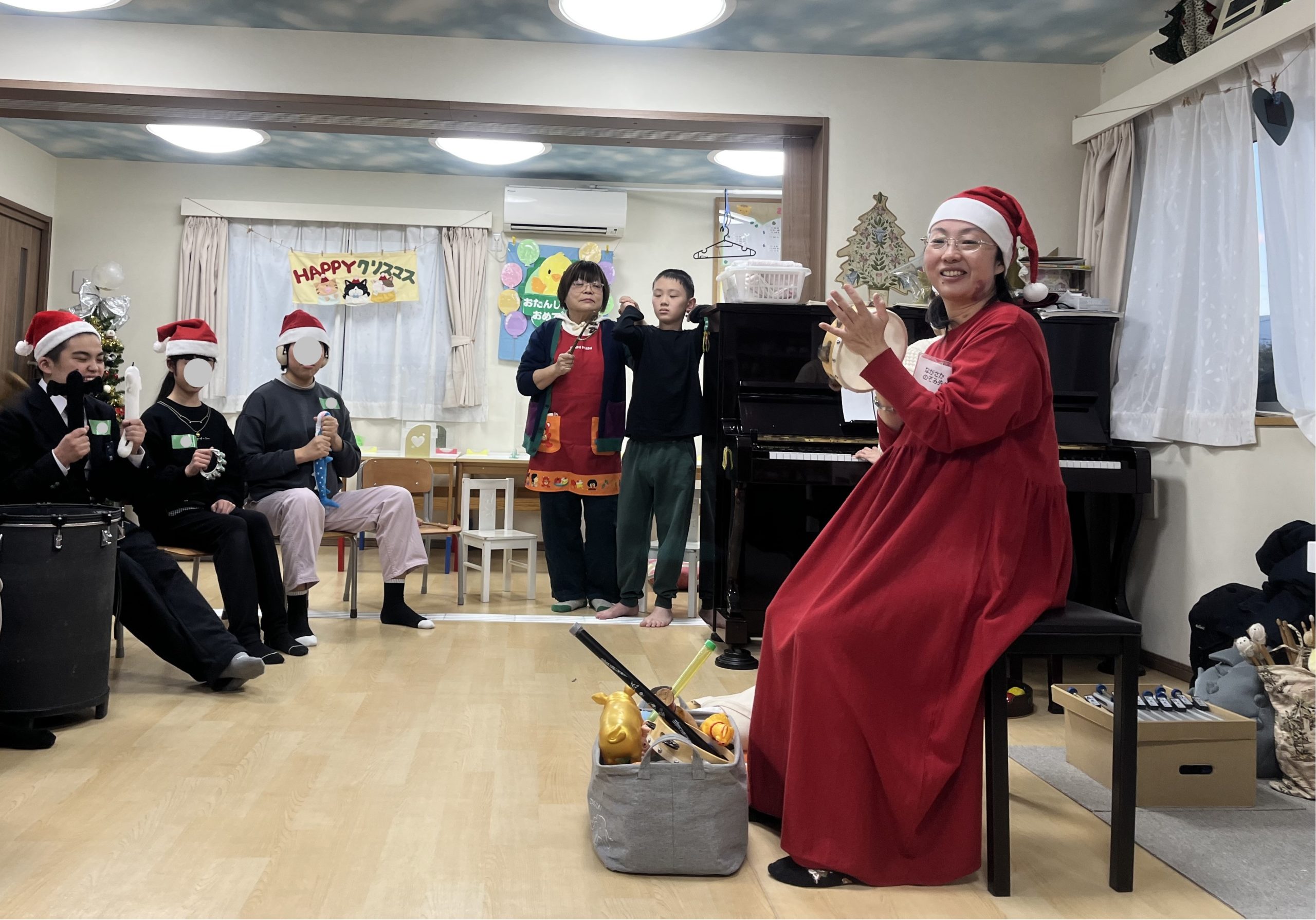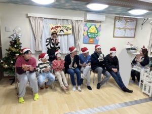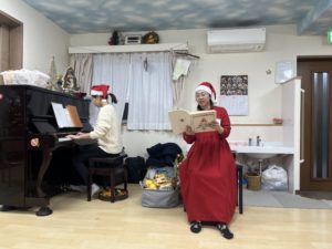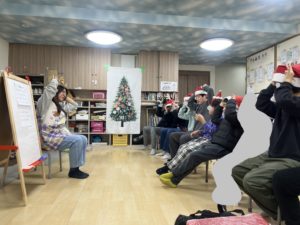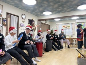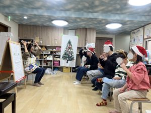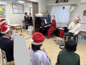 音楽療法のクリスマスコンサートでは、先生の歌を聞いたり、様々な楽器を鳴らして楽しみました🥁